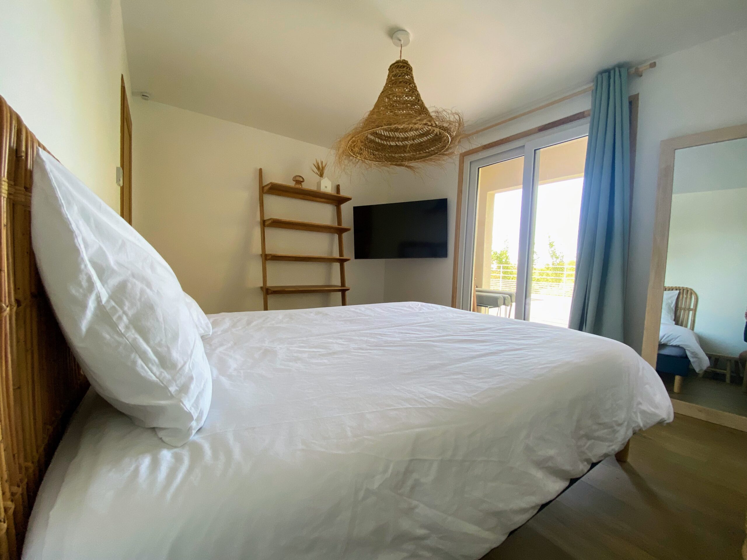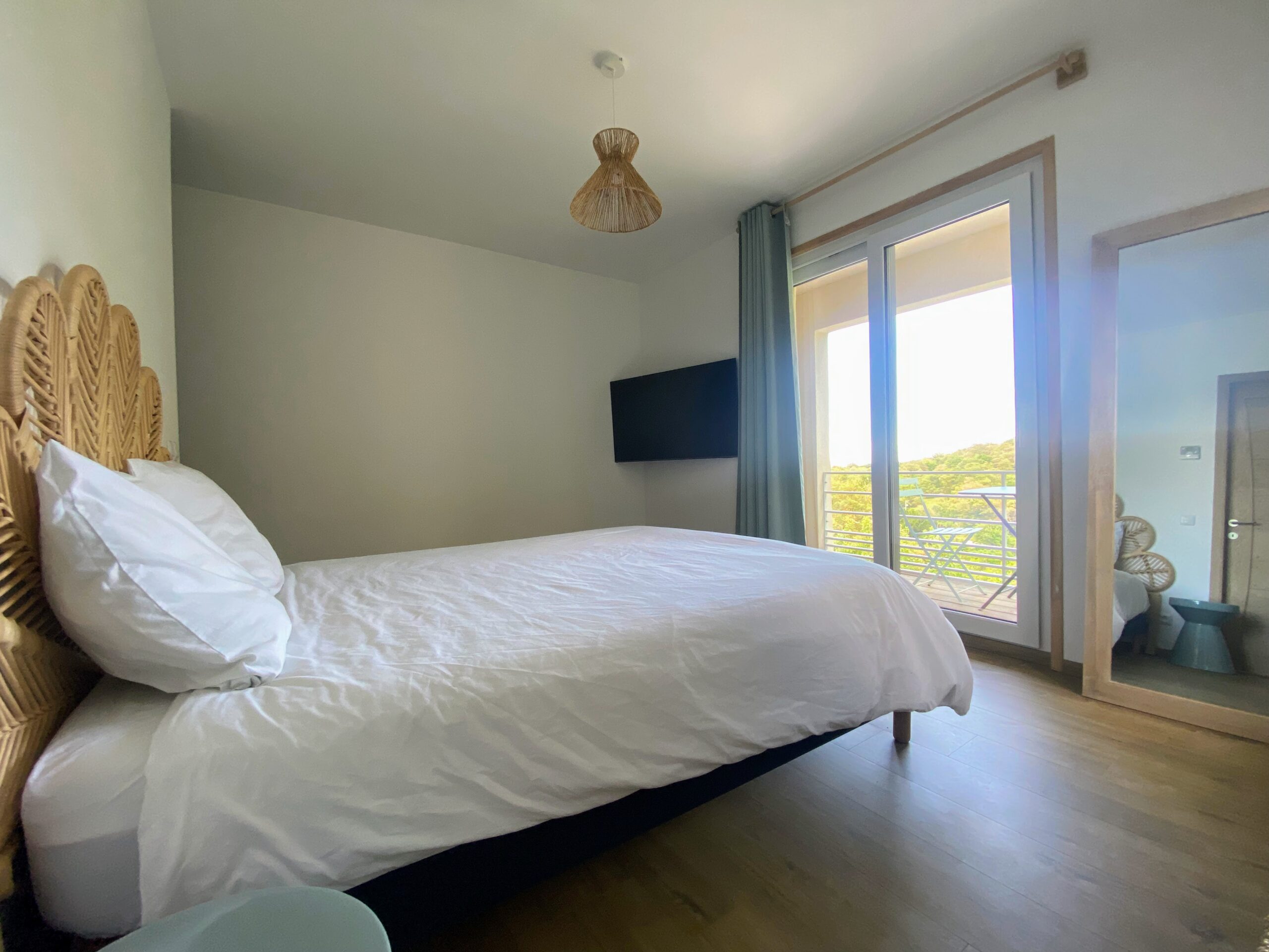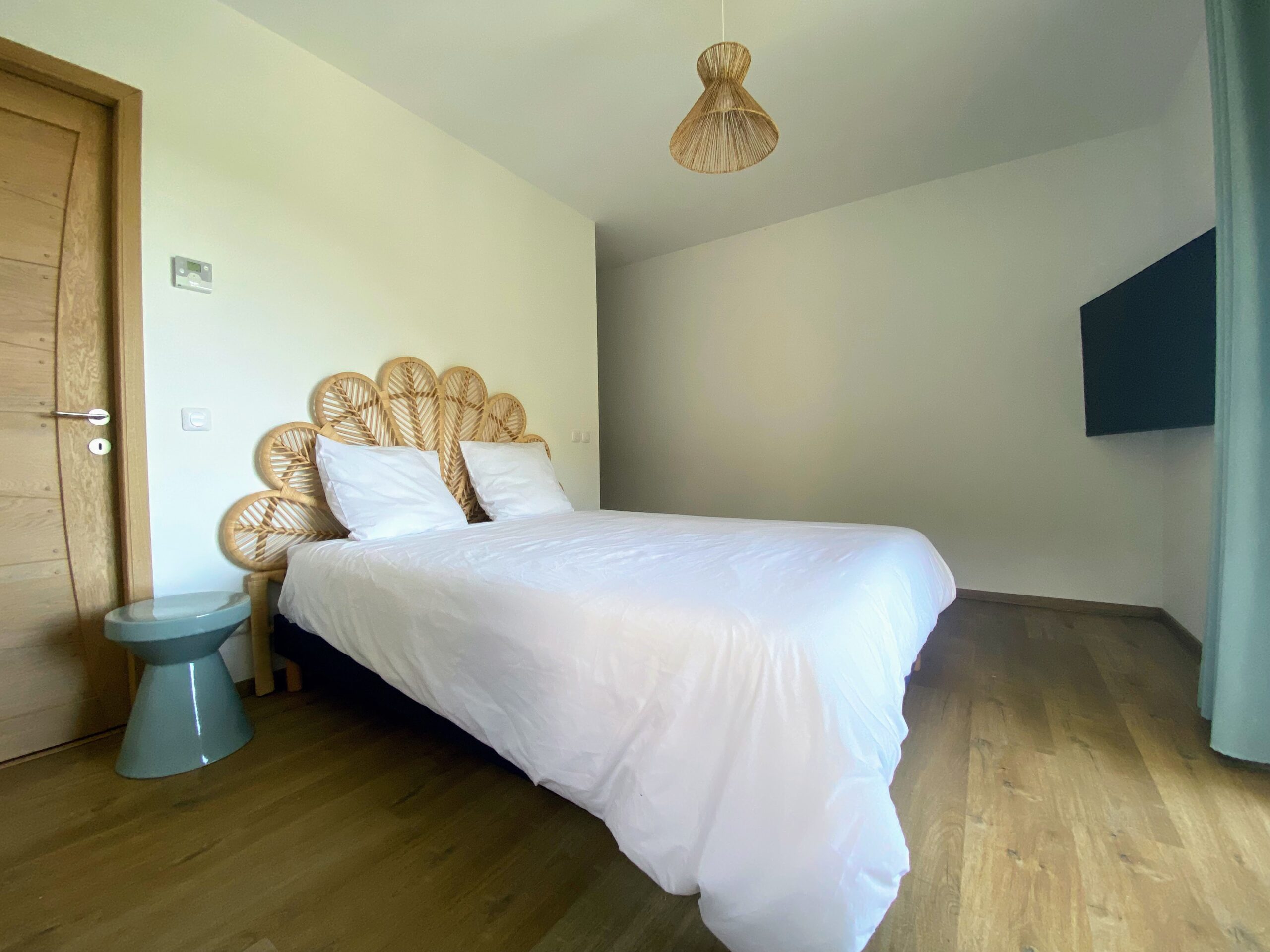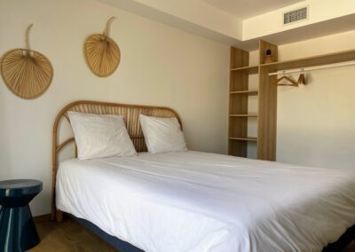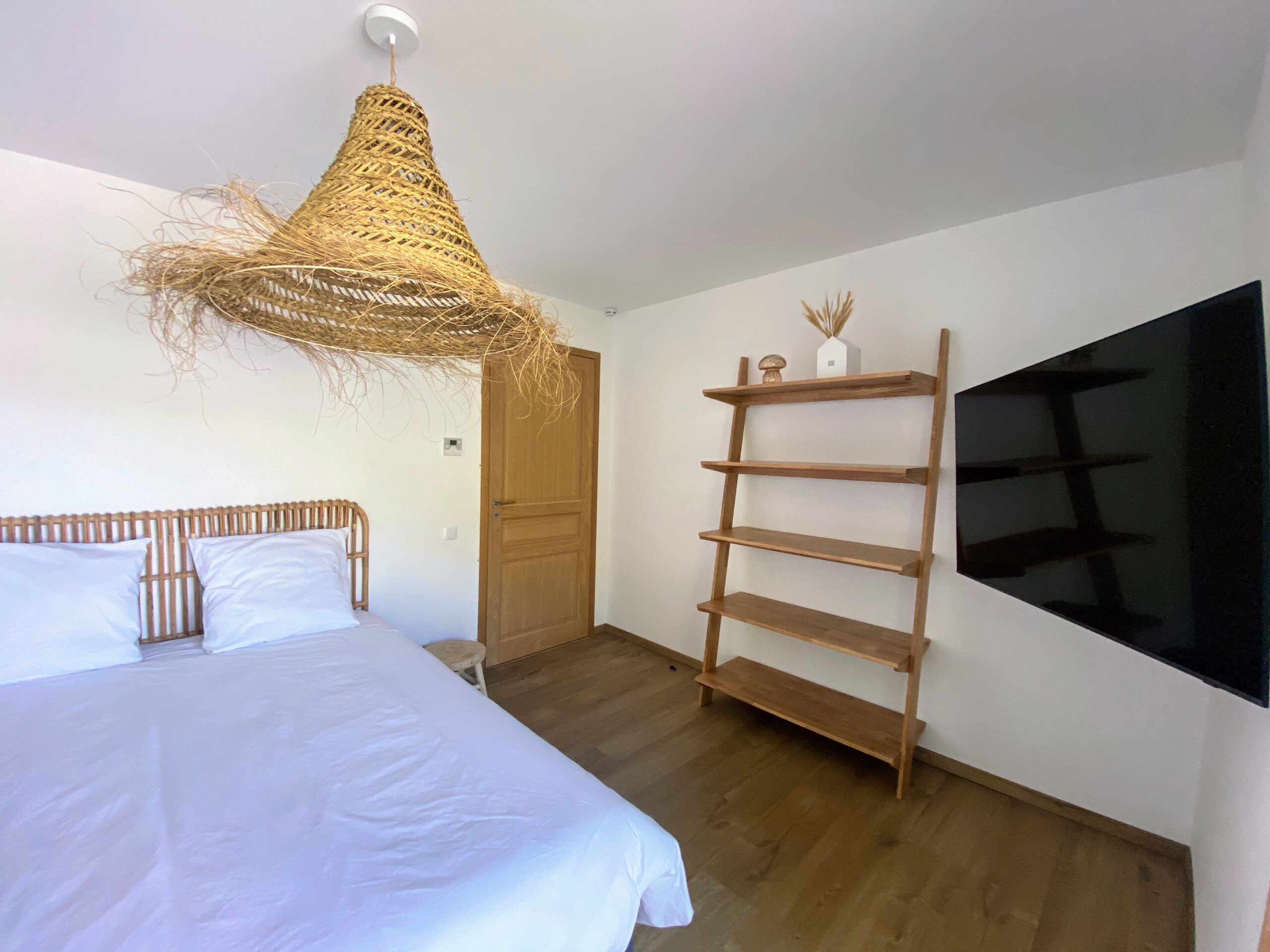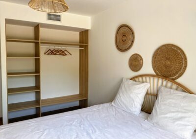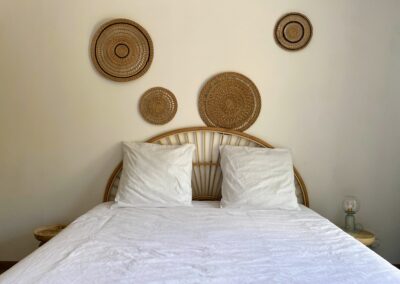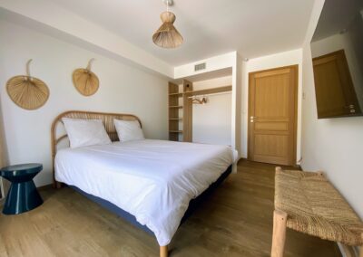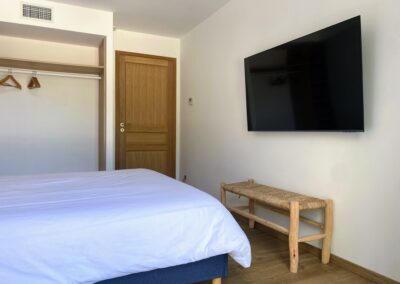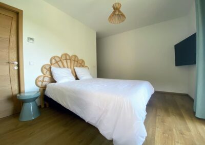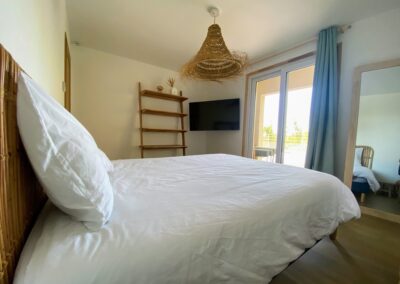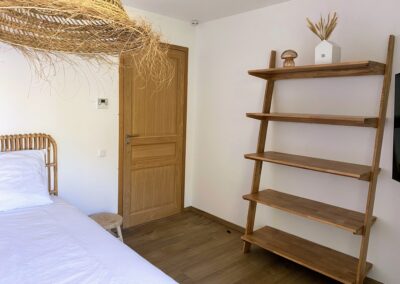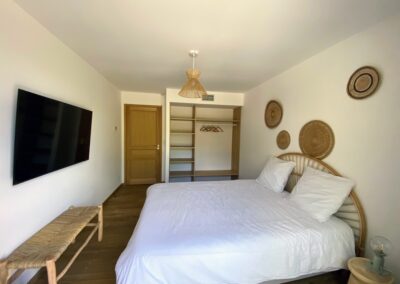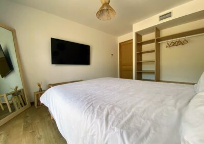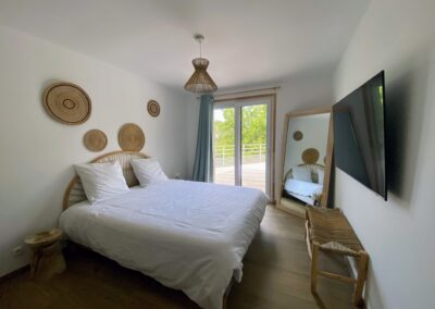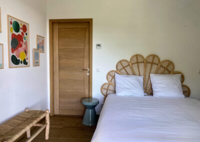 Chaque chambre de la villa a sa propre personnalité, mais toutes partagent le même confort : lit 160×200, TV 59″, grand dressing, rideaux obscurcissants et une vue apaisante sur la montagne. Les 3 chambres suivantes ont un accès direct à la terrasse et à la piscine, tandis que la suite parentale se distingue avec son balcon privatif, sa salle de douche attenante et son espace généreux. La décoration, sobre et naturelle, est relevée de touches colorées qui créent une ambiance douce et élégante, propice à la détente.