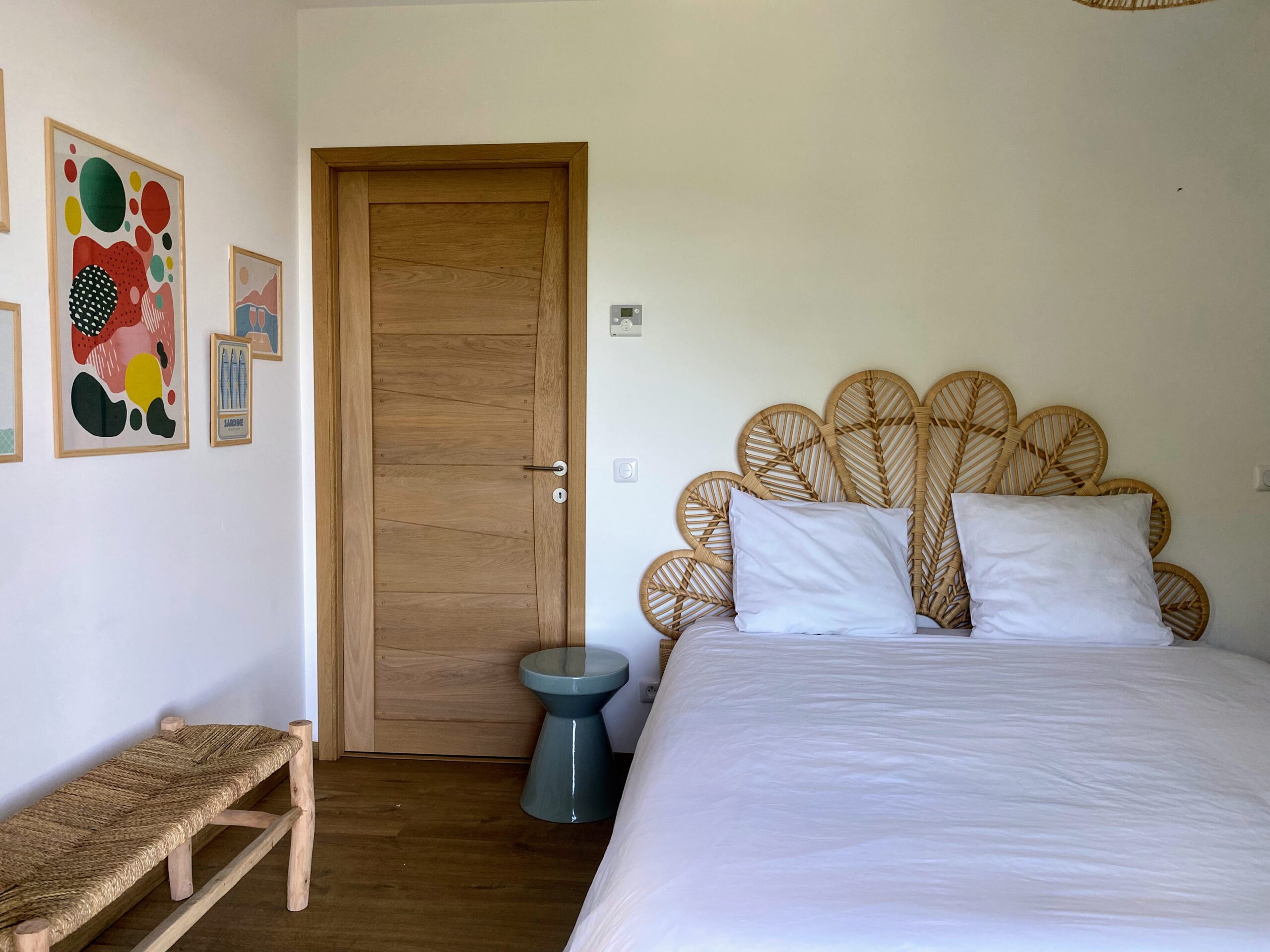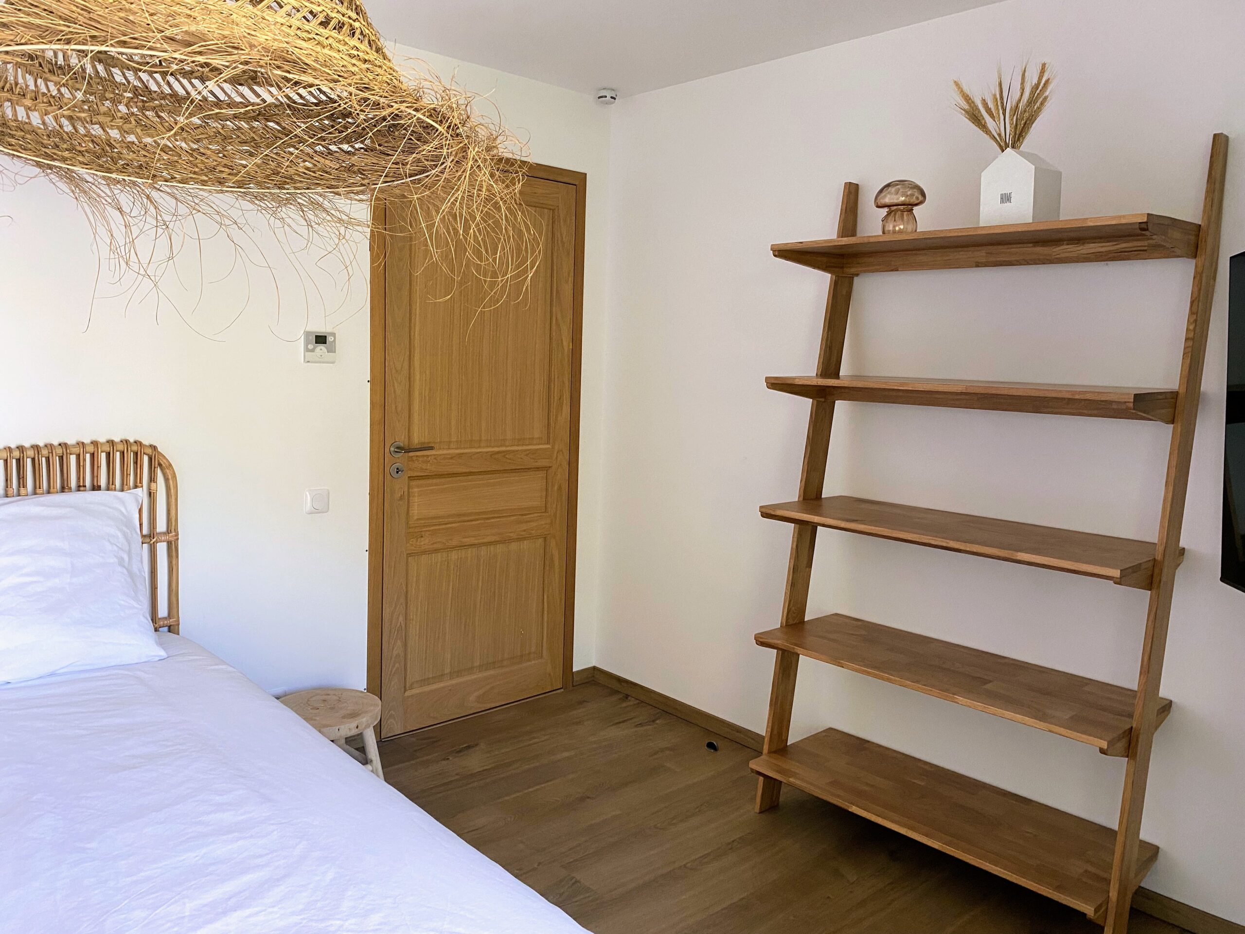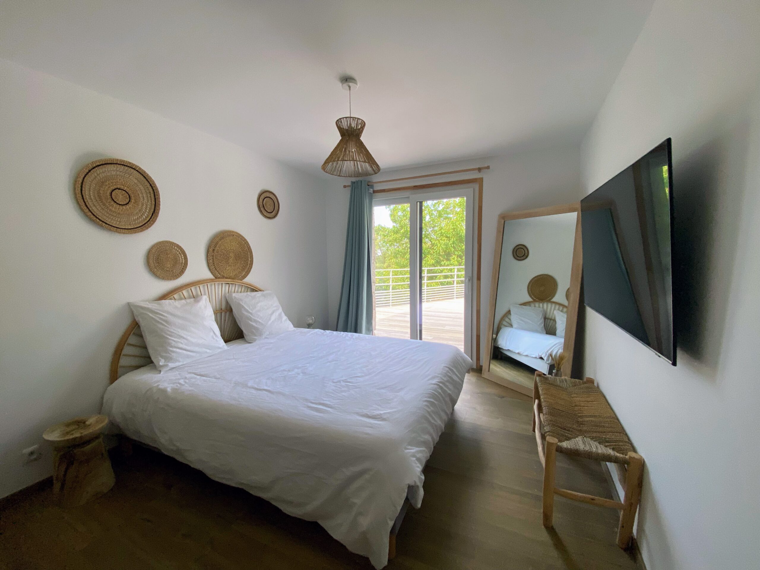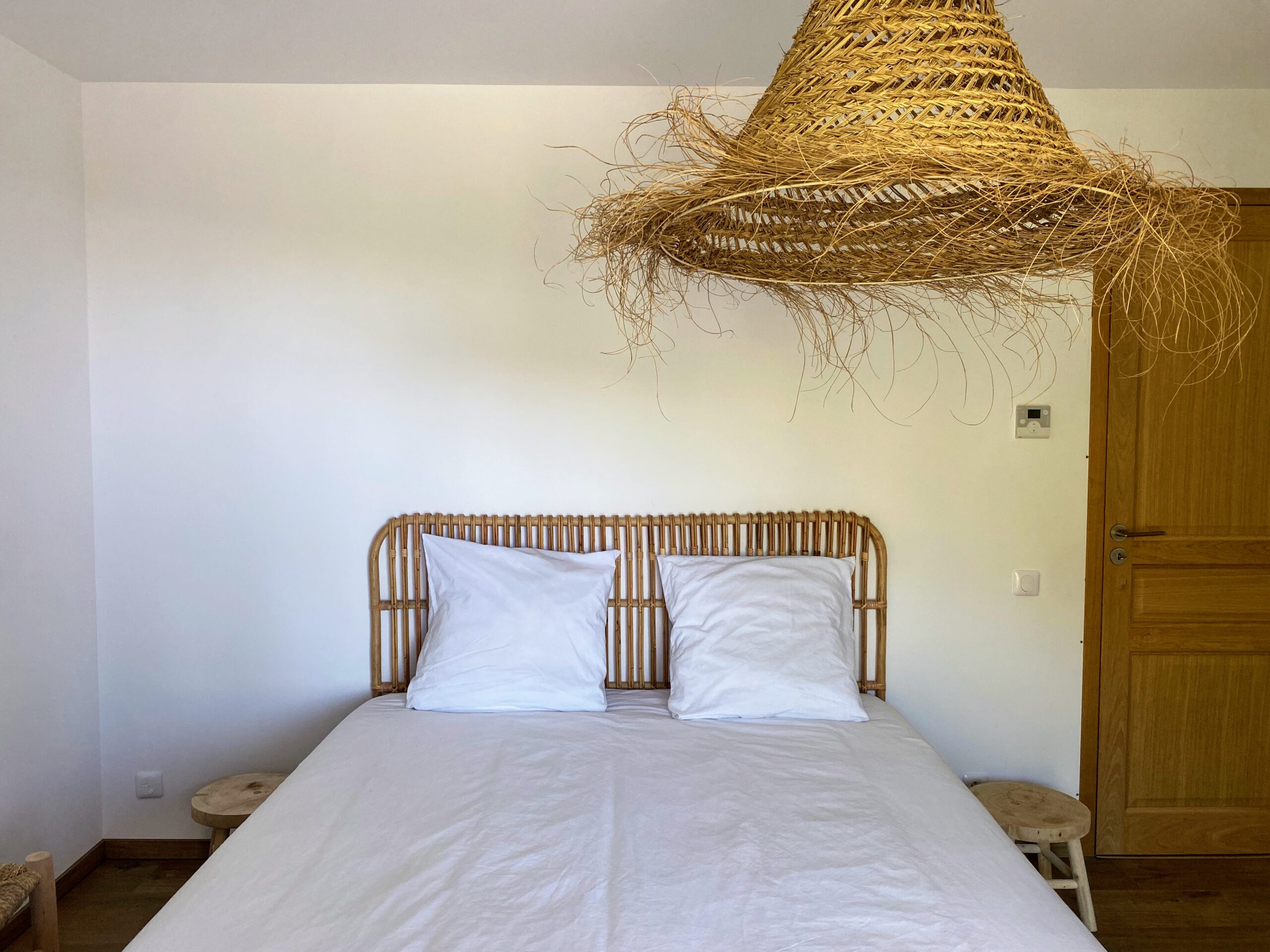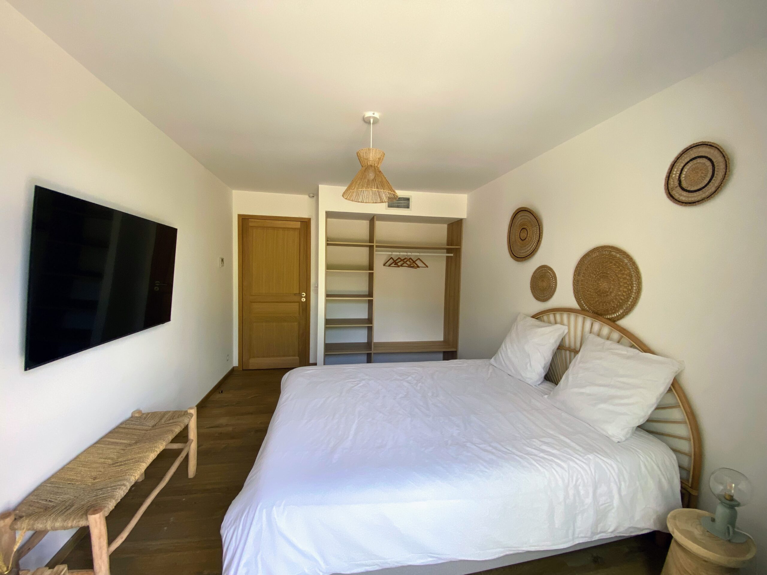 Chaque chambre de la villa a sa propre personnalité, mais toutes partagent le même confort : lit 160×200, TV 59″, grand dressing, rideaux obscurcissants et une vue apaisante sur la montagne. Les 3 chambres suivantes ont un accès direct à la terrasse et à la piscine, tandis que la suite parentale se distingue avec son balcon privatif, sa salle de douche attenante et son espace généreux. La décoration, sobre et naturelle, est relevée de touches colorées qui créent une ambiance douce et élégante, propice à la détente.