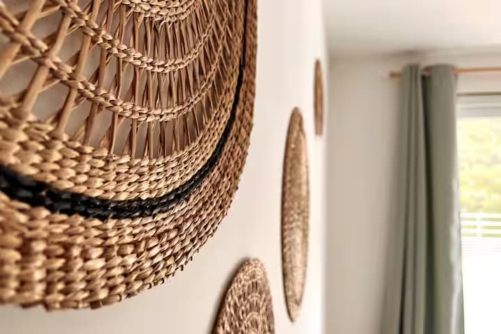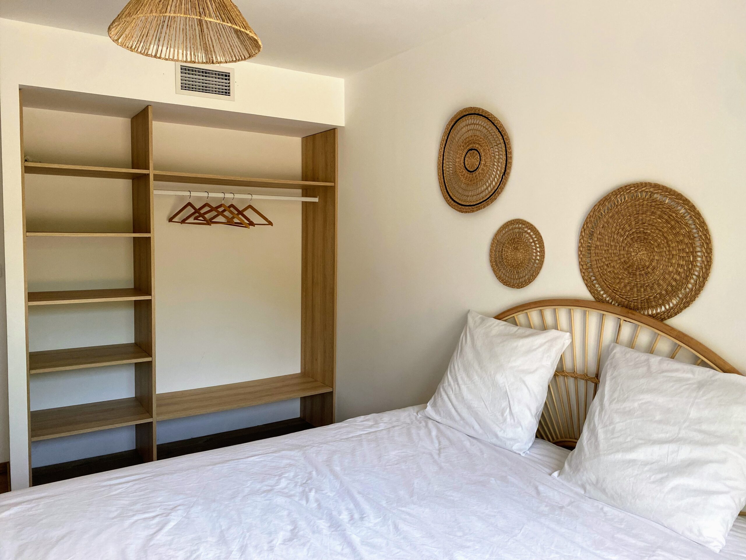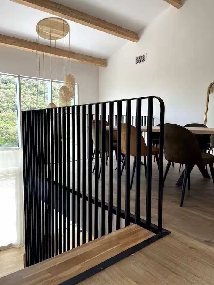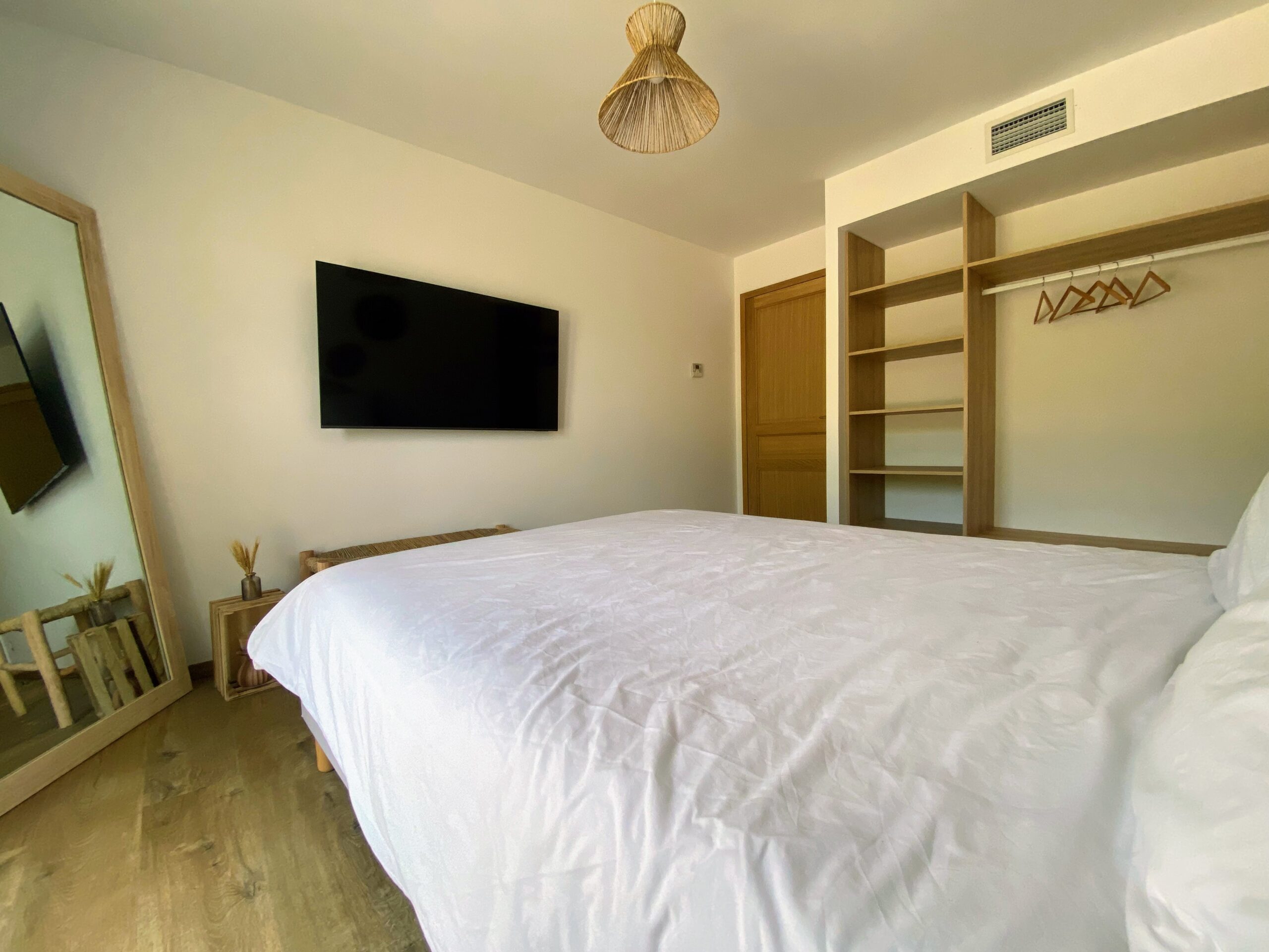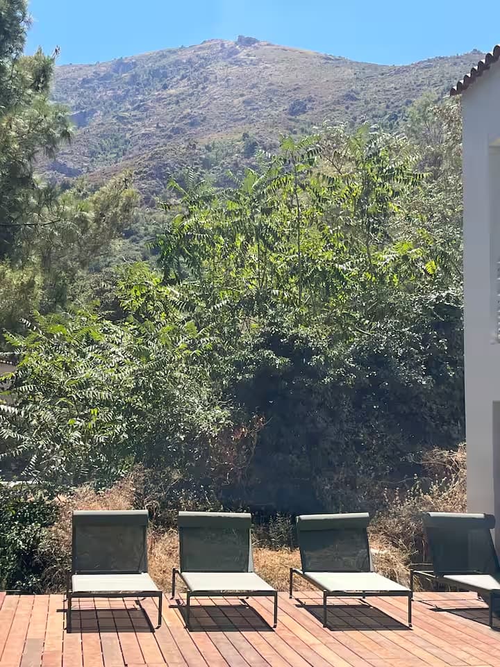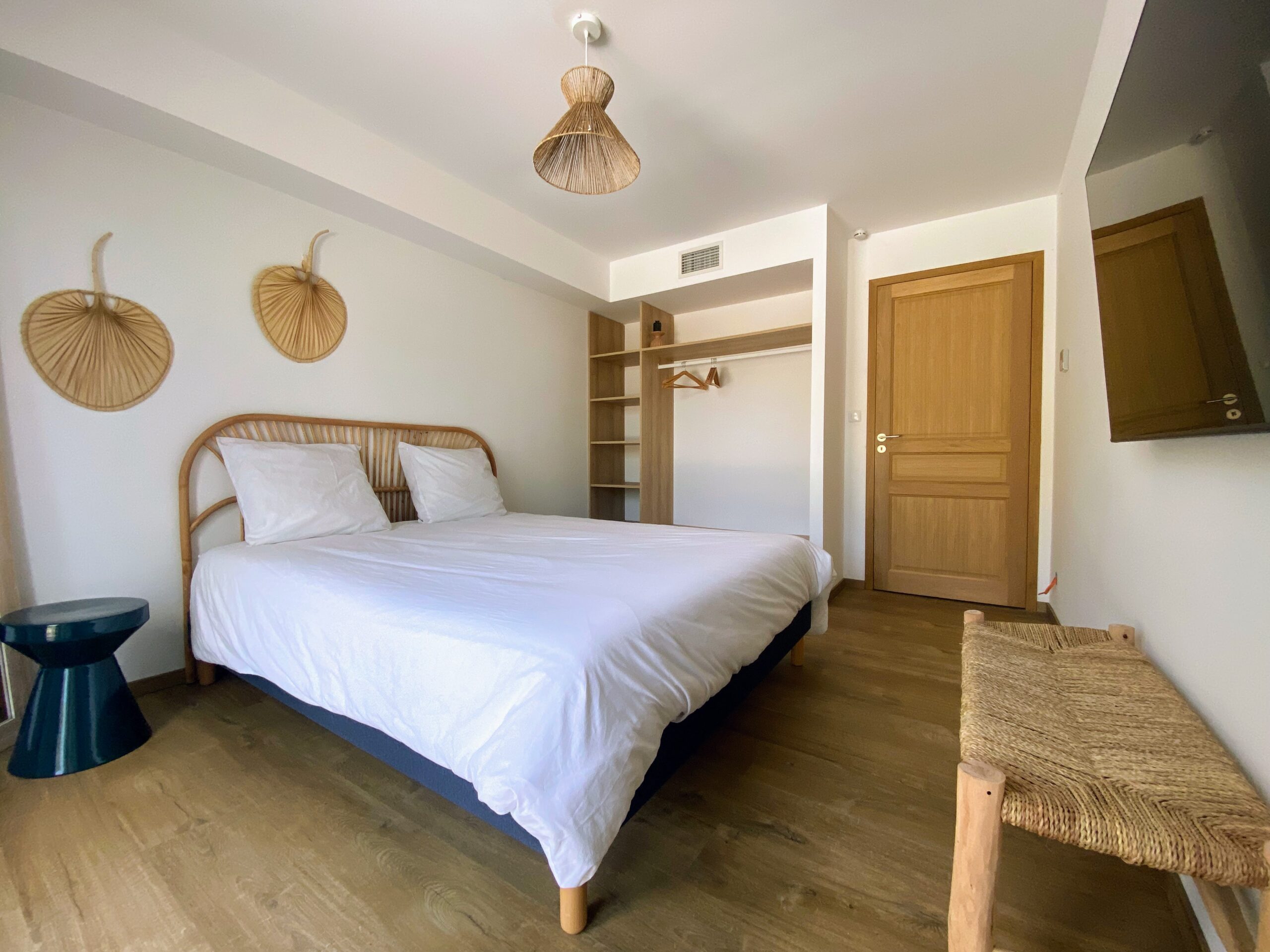 Chaque chambre de la villa a sa propre personnalité, mais toutes partagent le même confort : lit 160×200, TV 59″, grand dressing, rideaux obscurcissants et une vue apaisante sur la montagne. Les 3 chambres suivantes ont un accès direct à la terrasse et à la piscine, tandis que la suite parentale se distingue avec son balcon privatif, sa salle de douche attenante et son espace généreux. La décoration, sobre et naturelle, est relevée de touches colorées qui créent une ambiance douce et élégante, propice à la détente.