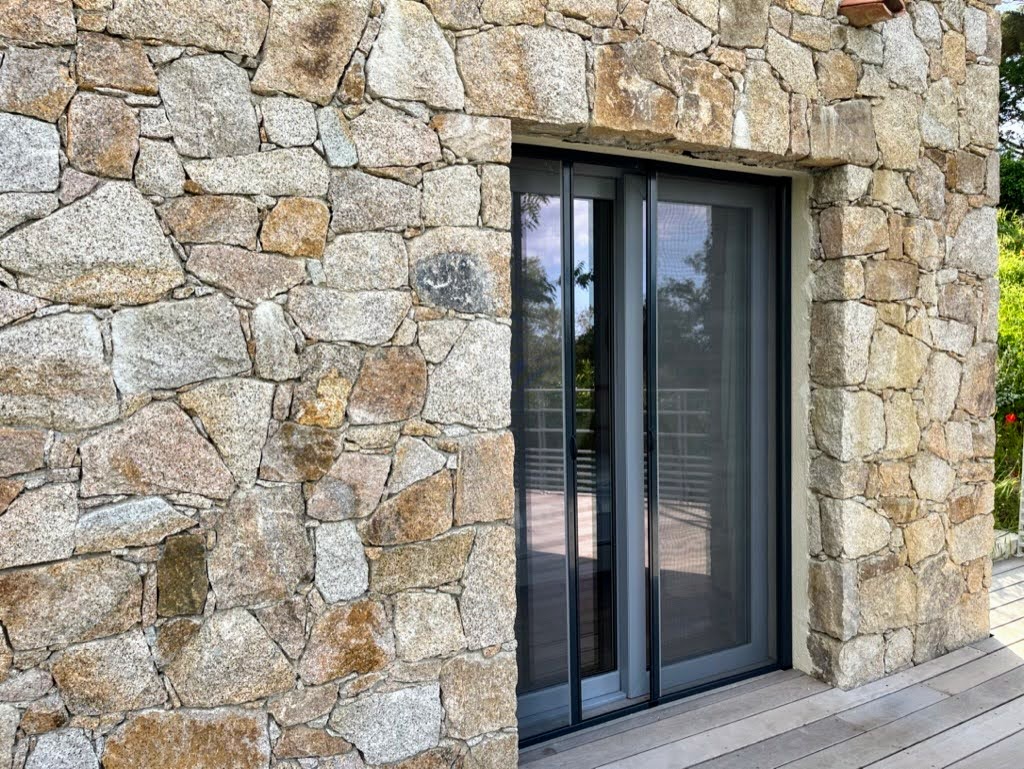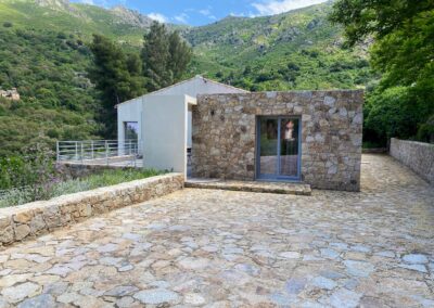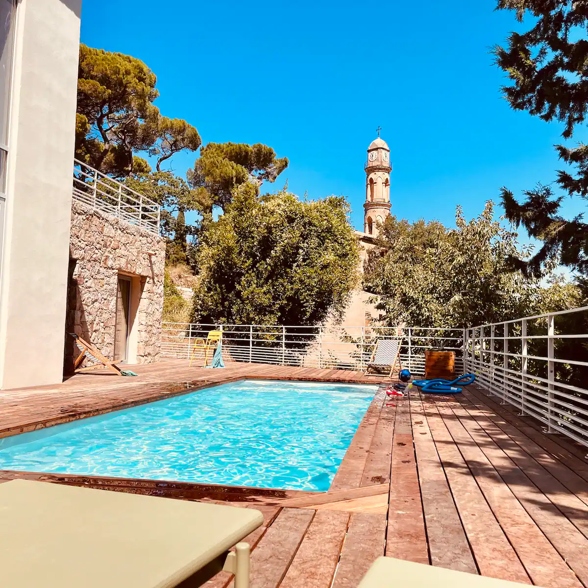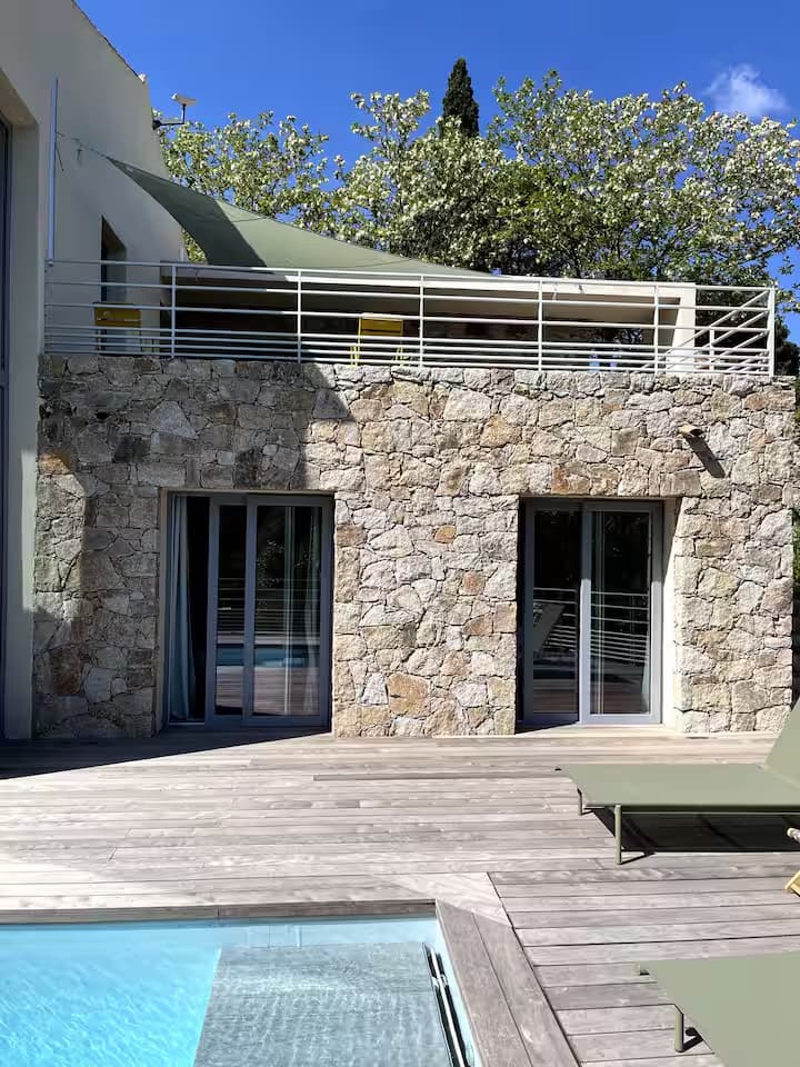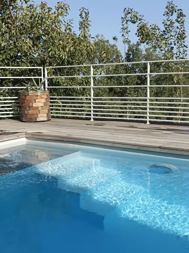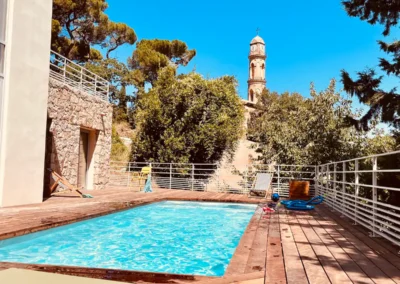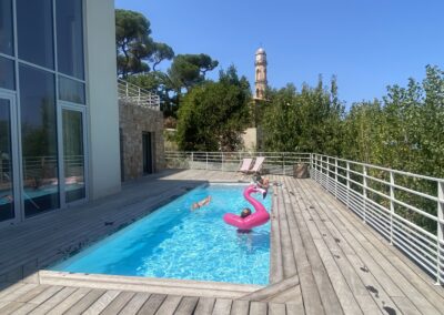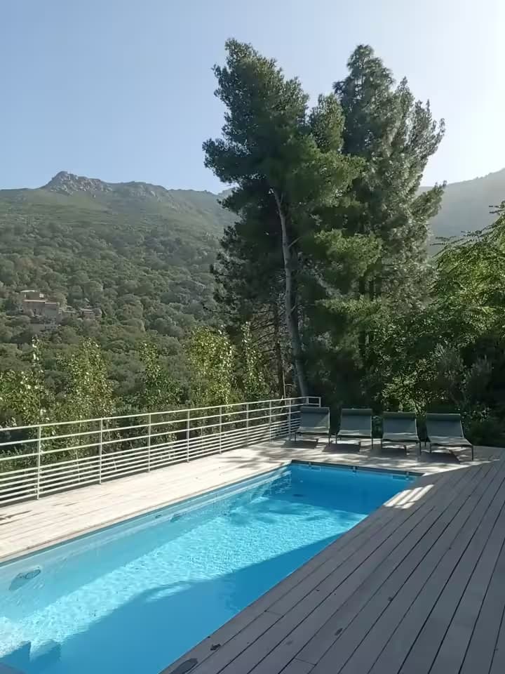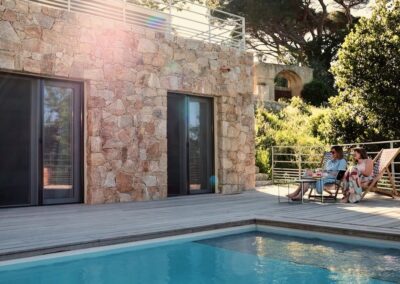 Pensée pour le plaisir de tous, on accède à la piscine depuis le salon, l’escalier en pierre extérieur qui part de la terrasse repas ou directement depuis 3 des chambres, via des baies vitrées. Chauffée sur demande, éclairée le soir et sécurisée par un volet électrique, elle invite aussi bien aux jeux en famille qu’à la baignade tranquille face au panorama montagne et maquis. Autour, sur la terrasse en bois, chaises longues et chiliennes attendent les amateurs de farniente, de lecture ou de sieste au soleil.