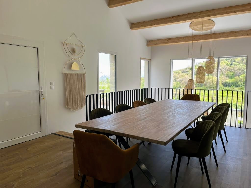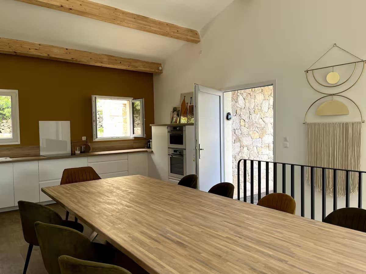 Dans cette cuisine-salle à manger en mezzanine, chaque détail invite au partage. La table accueille jusqu’à 10 personnes, dans un décor à la fois chic et naturel. La cuisine, spacieuse et entièrement équipée (réfrigérateur américain, four, plaque à induction…), ravira tous les cuisiniers. Machines à café, grille-pain XL, vaisselle et ustensiles sont là pour tout simplifier. Et côté fenêtres : une vue magique sur le clocher, le maquis et la mer.