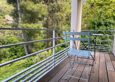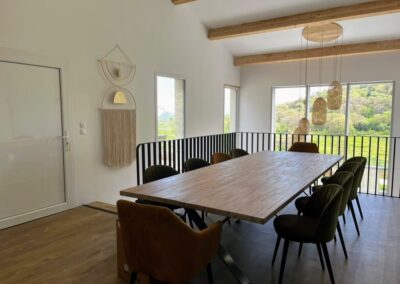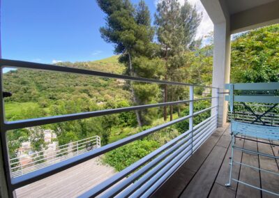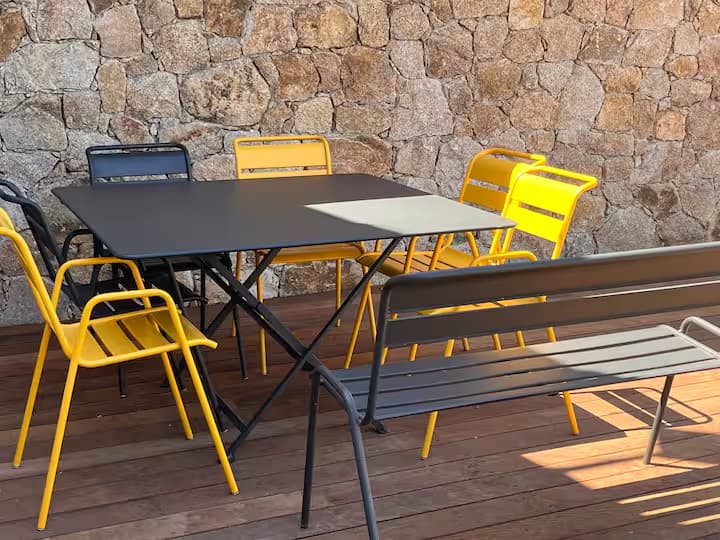 À quelques pas de la cuisine, cette grande terrasse extérieure devient vite du printemps à l’automne le cœur des repas partagés. Installée au-dessus de la piscine, elle offre une vue à couper le souffle sur le maquis, les montagnes, le clocher du village… et même la mer à l’horizon. Autour de la table pour 8 convives, on savoure un barbecue au gaz Weber, à l’ombre d’une voile ajustable, tandis que le soir venu, les lampes nomades à lumière réglable prolongent les dîners dans une atmosphère douce et chaleureuse. Un escalier discret relie directement la terrasse à la piscine pour aller piquer une tête entre deux grillades.