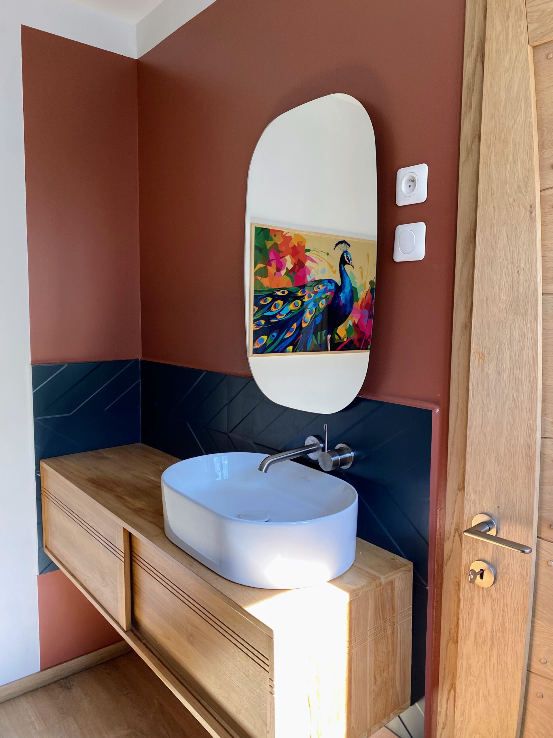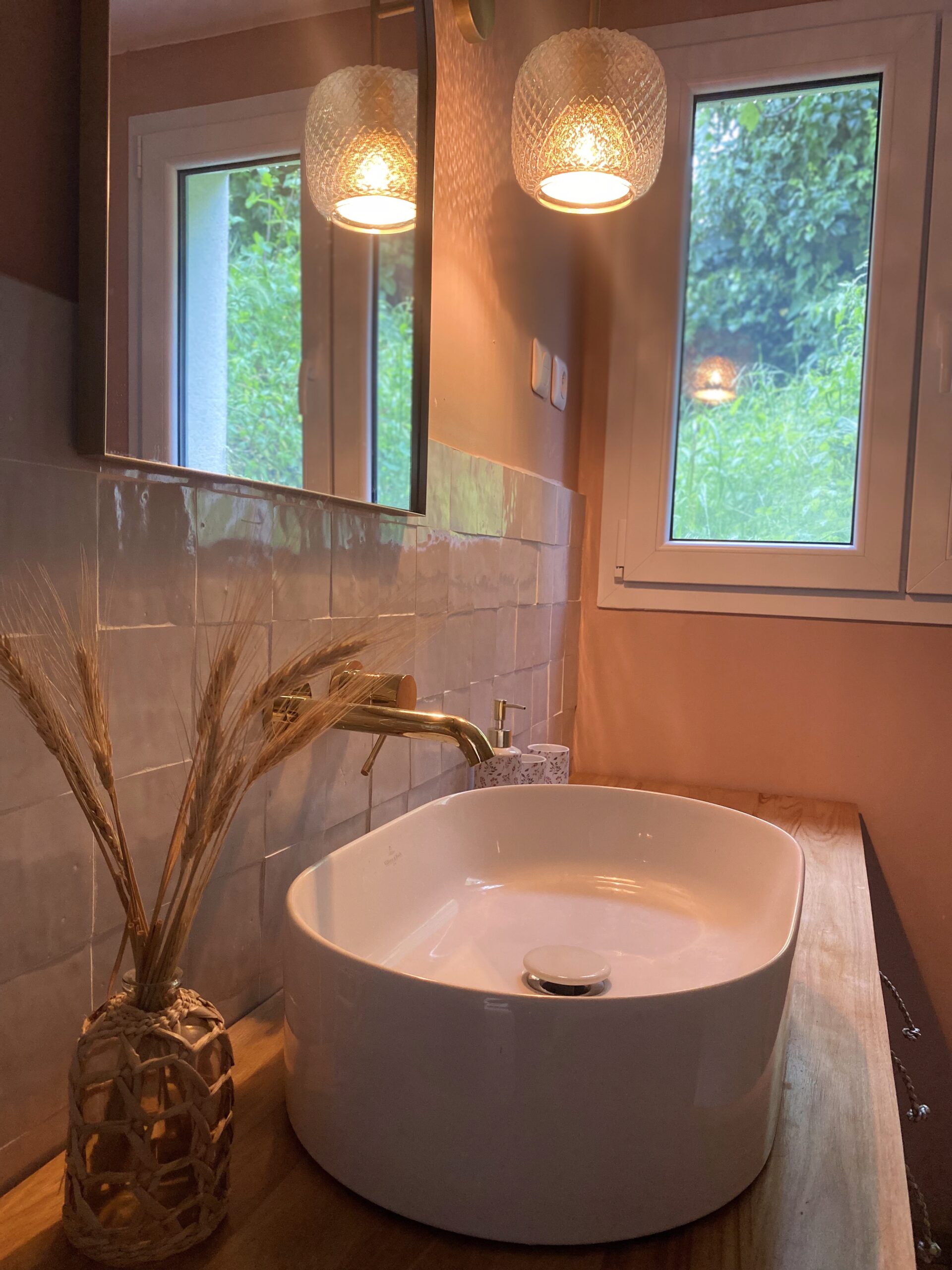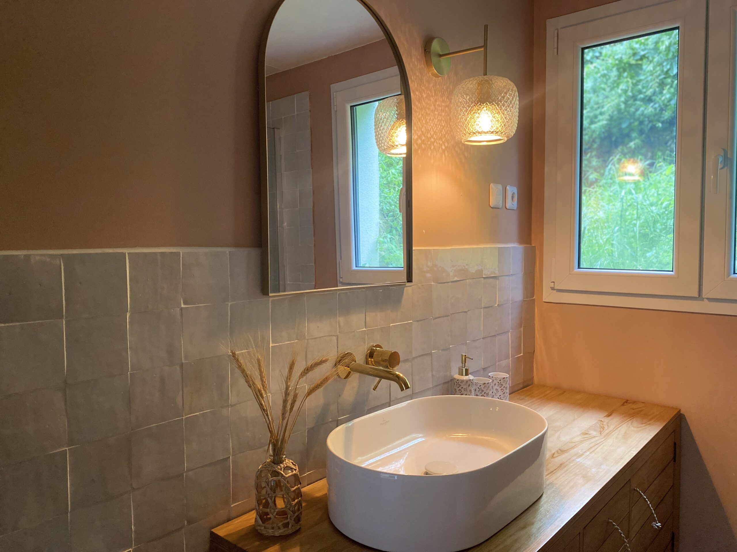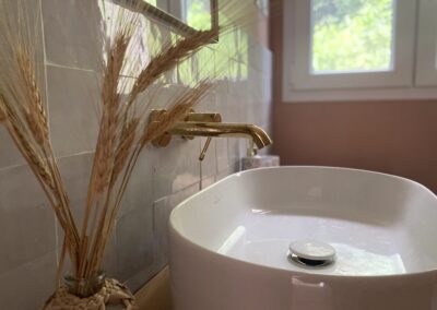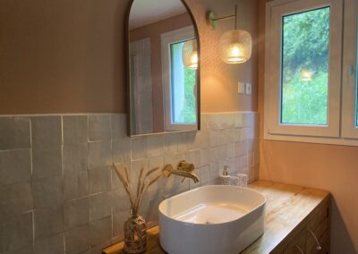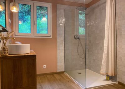 Accessible aux autres chambres, cette salle de douche partagée conjugue esthétique raffinée et équipement premium. Le carrelage en zellige, aux tons beige rosé, lui confère une atmosphère douce et dépaysante. Tout y est : meuble vasque en bois, grande douche, sèche-serviettes Bluetooth, sèche-cheveux professionnel, shampooing, gel douche et linge de qualité. Parfaite pour accueillir confortablement famille ou amis, dans une ambiance apaisante et soignée.