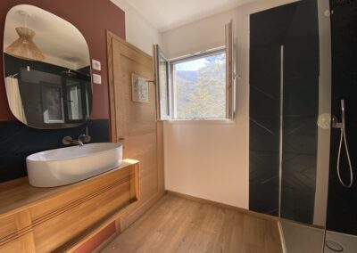 Attenante à la chambre, la spacieuse salle de douche privative prolonge cette sensation d’apaisement. Vue montagne, meuble vasque en bois, douche généreuse, sèche-serviettes Bluetooth et matériaux haut de gamme : tout a été pensé pour conjuguer bien-être et élégance. Une chambre où l’on se sent bien, tout simplement.