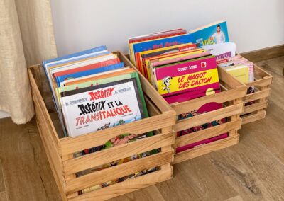 La villa prévoit une chaise haute confortable, un lit parapluie avec matelas, des couverts adaptés, ainsi que des jeux d’eau et de société pour petits et grands. Les escaliers ne sont pas équipés de barrières, la surveillance parentale reste donc indispensable.