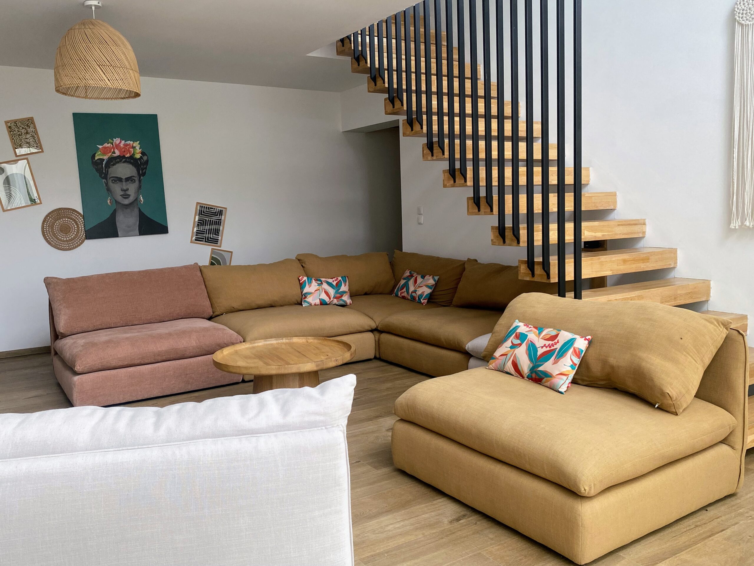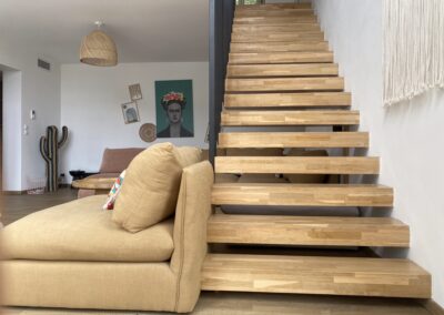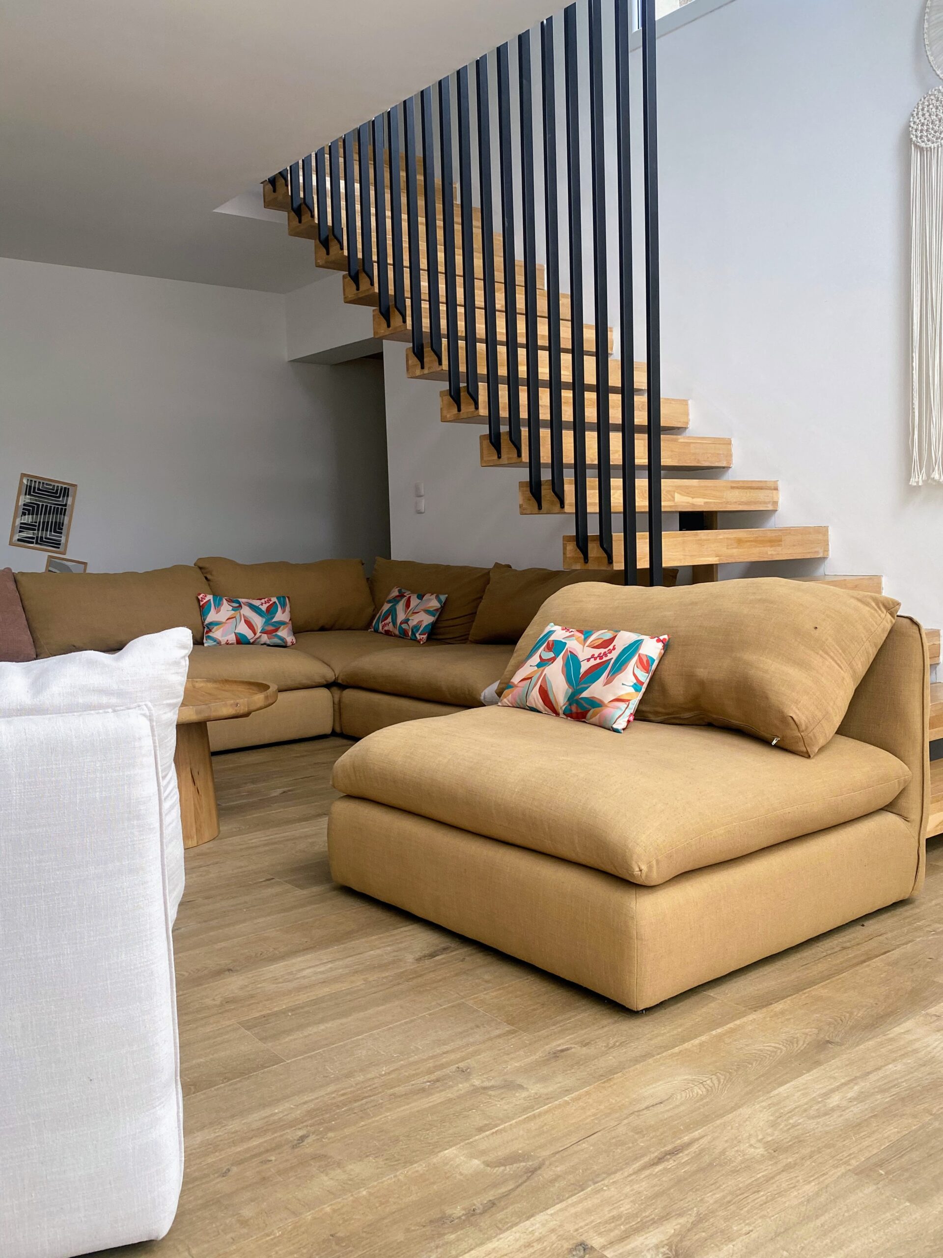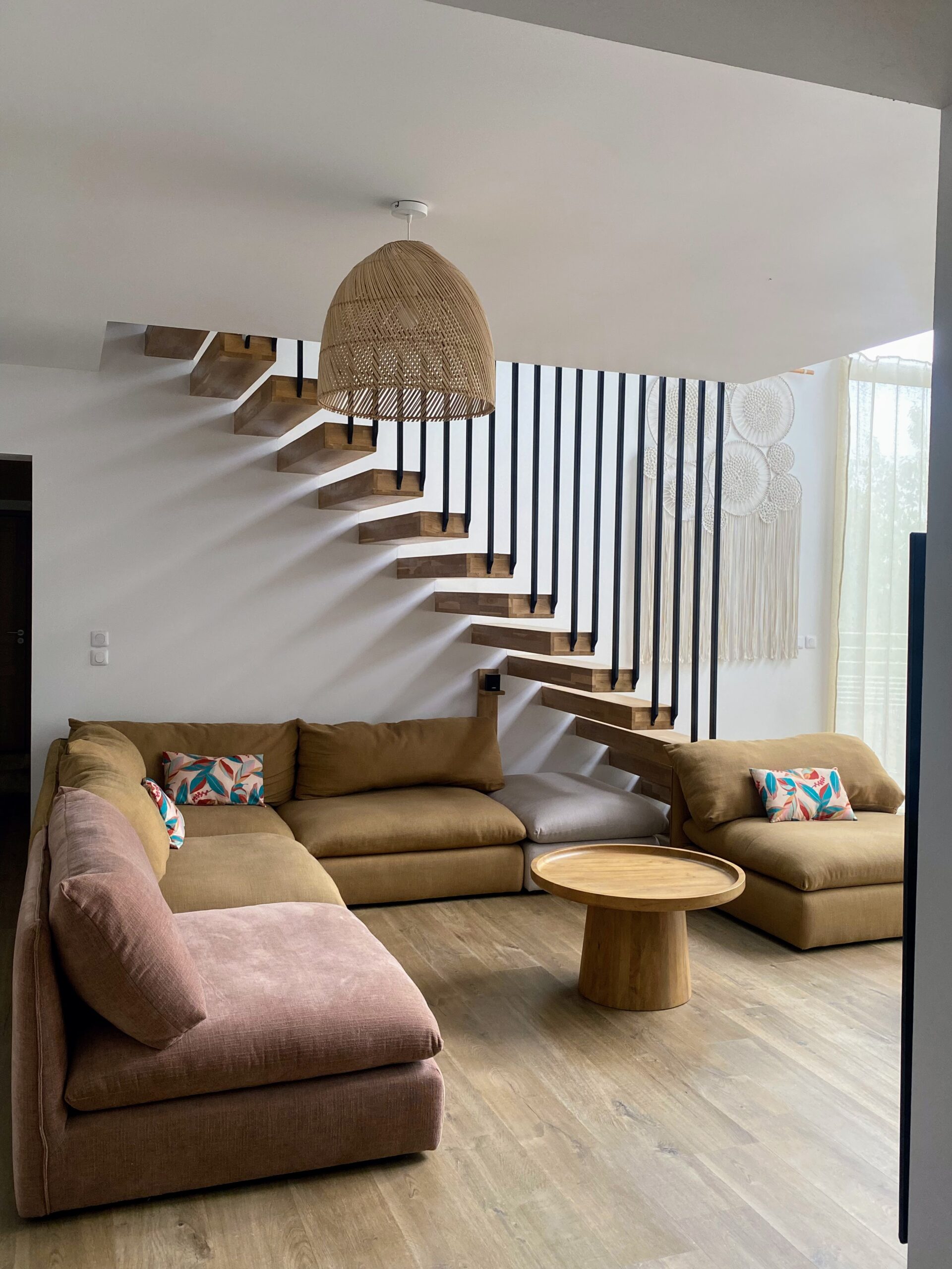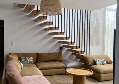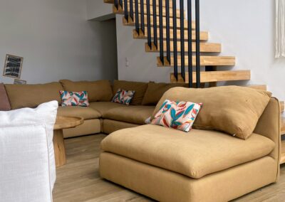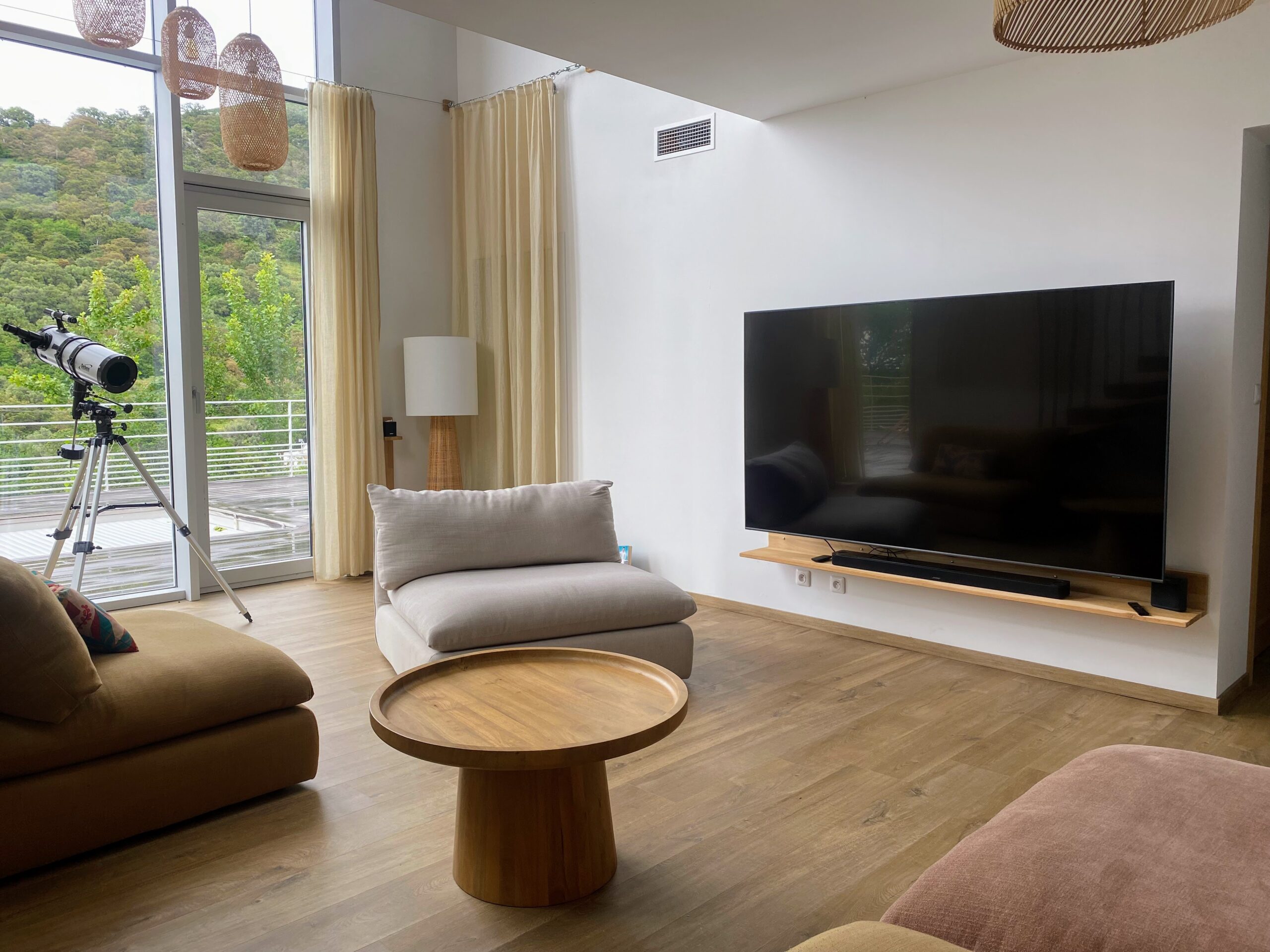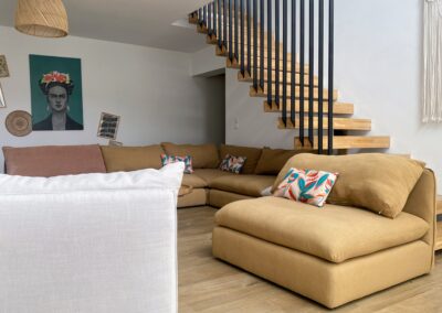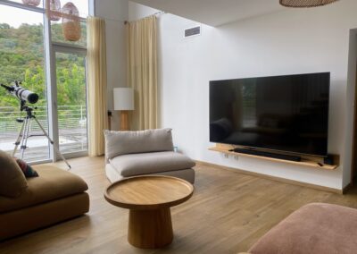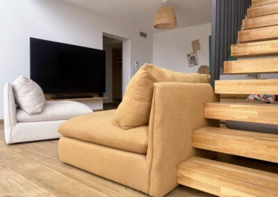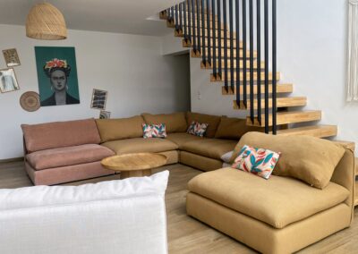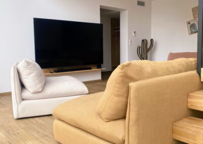 Imaginez-vous lové dans un vaste canapé modulable en U, entouré de vos proches, prêt pour une soirée cinéma avec une TV 70″ et un son Bose immersif. Ce salon, baigné de lumière grâce à sa grande baie vitrée, s’ouvre directement sur la terrasse ensoleillée et la piscine, avec une vue apaisante sur les montagnes corses. L’ambiance ? Chaleureuse, élégante et colorée, un vrai cocon où l’on a envie de poser ses valises… et d’y rester.