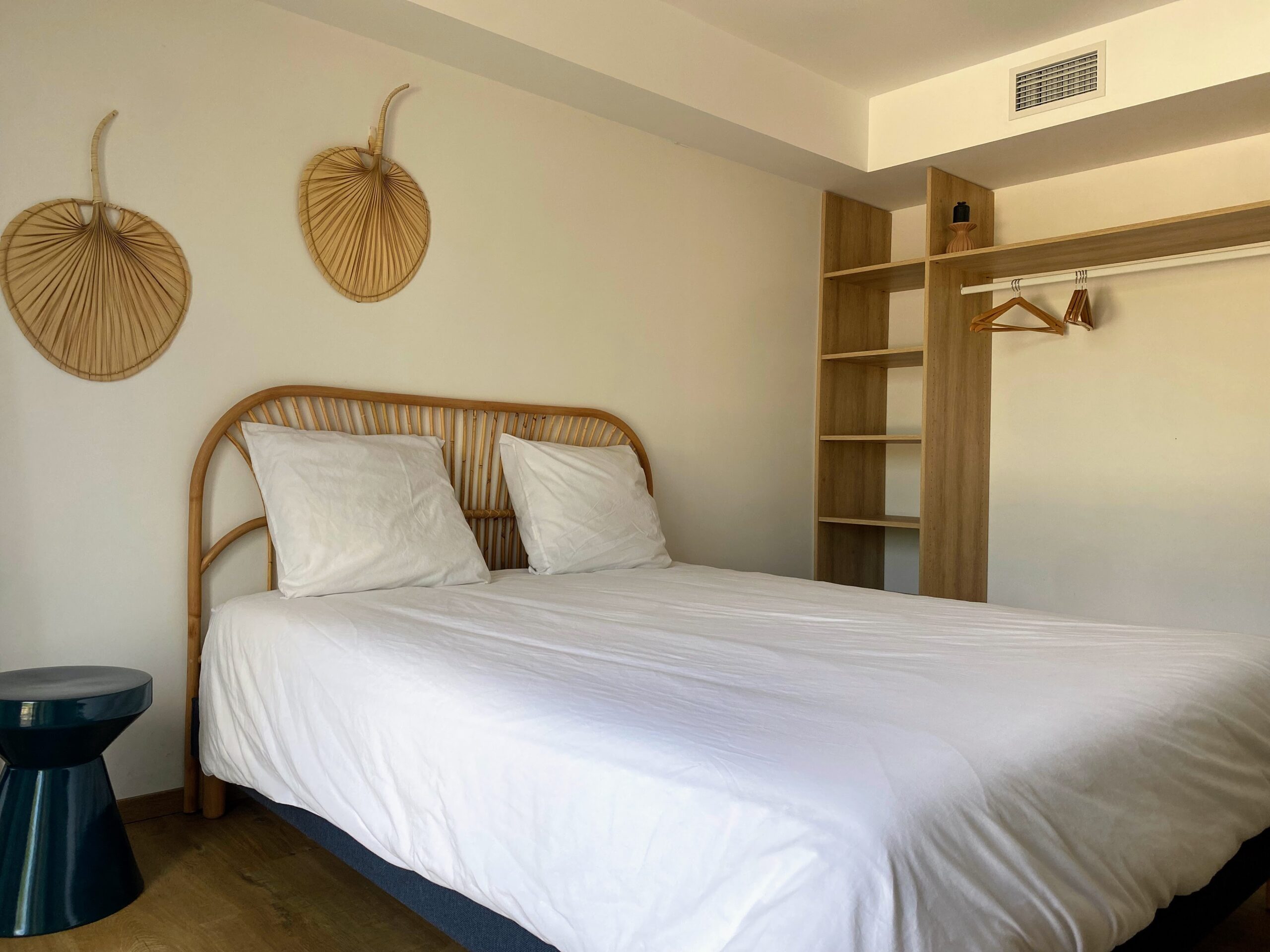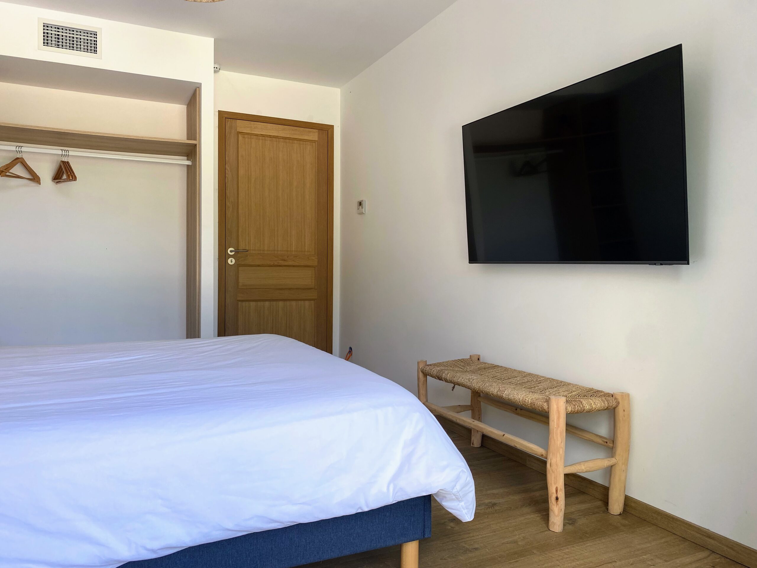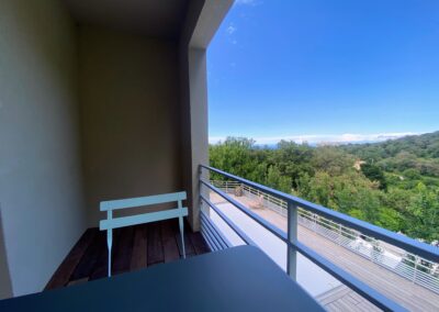 Nichée à l’écart, la suite parentale est un véritable cocon, pensé pour ceux qui aiment se réveiller au calme, face à la beauté du paysage. Sa déco douce et colorée, son lit 160×200, sa TV 59″, son grand dressing et ses rideaux obscurcissants couleur nature en font une pièce à la fois fonctionnelle et pleine de charme. Mais ce qui fait toute la différence, c’est son balcon privatif en bois, avec vue sur la montagne, la piscine et la mer — un coin parfait pour prendre un café en toute intimité.